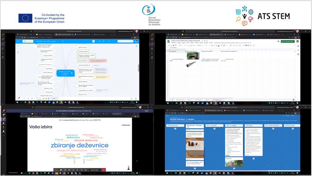 Udeleženci so v prvem delu srečanja doživeli ATS STEM učno enoto in ob tem razvijali STEM veščine/kompetence s pomočjo različnih spletnih aplikacij. S pomočjo videokonferenc v Teams okolju so z lastnimi napravami delali z različnimi spletnimi aplikacijami (Mentimeter, Mind Meister, AWW Board, Padlet, Google Risbe in Google zvezek, GDocs dokumenti). Po principu reševanja problemov so s pomočjo IKT analizirali problem s področja trajnostnega razvoja, iskali mogoče rešitve, izbrali skupno rešitev in načrtovali izdelek kot njeno rešitev (prototip). V drugem delu so se urili v prepoznavanju ključnih elementov ATS STEM učne enote, ki bodo tudi predmet evalvacije v pilotnem šolskem letu. Srečanja se je udeležilo več kot osemdeset učiteljev in nekaj ravnateljev. Učitelji so tekom celotnega izobraževanja prikazali veliko veščin na področju digitalnih kompetenc, reševanja problemov in ustvarjalnosti in pridobili nova znanja, ki jim bodo pripomogla pri načrtovanju medpredmetnih učnih enot v naslednjem šolskem letu.